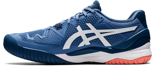 The GEL-RESOLUTION® 8 (Wide) tennis shoe promotes a responsive stride with a close-to-the-court feel, while offering more space in its interior for those with wider feet.