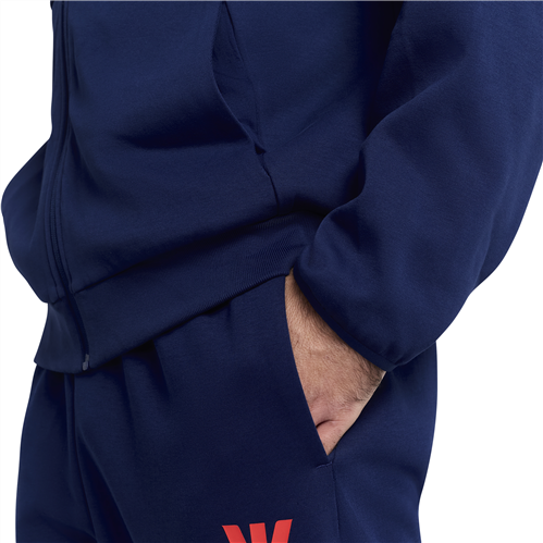 The jacket features a regular fit with a weft knitted construction, offering soft flexibility and easy layering over training gear or casual clothing. The hood adds extra protection when it’s chilly or windy, while the full zip allows quick on-and-off convenience between sessions.