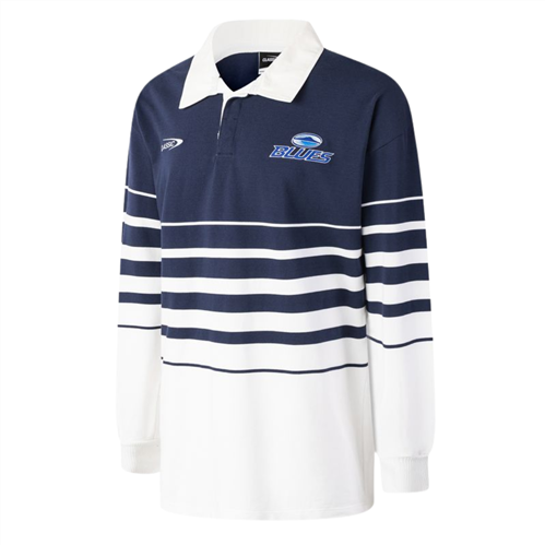 Made from a cotton knit, it delivers a soft, comfortable feel with enough weight to hold its shape. The bold navy and white stripes give it that traditional Blues look, while the classic collar keeps things timeless. It is the kind of jersey you throw on for a night game, a club catch up or watching the rugby at home.