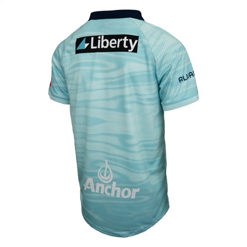 Teal design inspired by Auckland’s waterways, paired with a dark blue button-down collar.