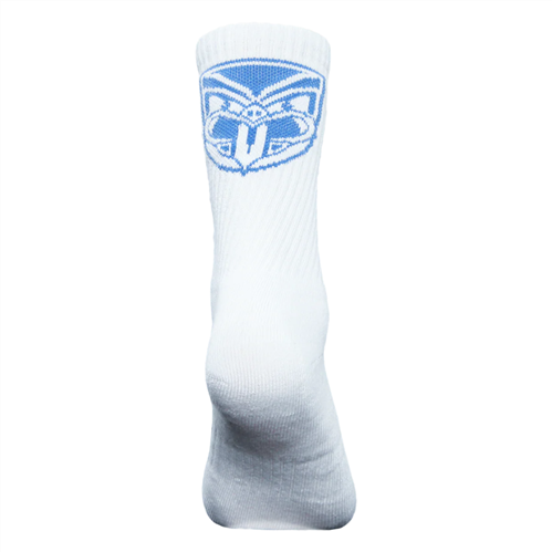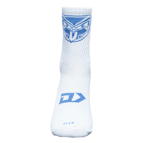 Official 2026 NZ Warriors Crew Socks in white with blue Tiki logo.