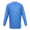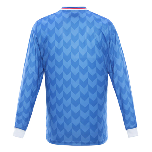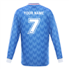 The shirt features a rich blue base with a subtle sublimated pattern throughout. Ribbed collar and ribbed cuffs give it that old school football feel, while the sublimated logos keep the finish clean and lightweight.