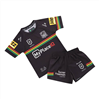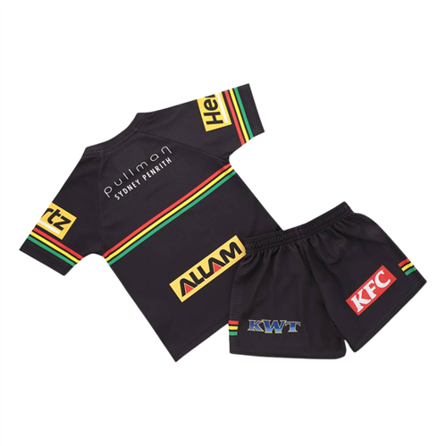 The set includes a toddler sized jersey and matching shorts. Both feature sublimated Penrith Panthers and sponsor logos for an authentic on field appearance without heavy prints.