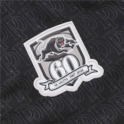 The chest features a metallic silicone 60th Season Panthers crest alongside the official NRL Telstra Premiership badge. Tonal detailing runs across the body, giving the black base a clean, modern finish.