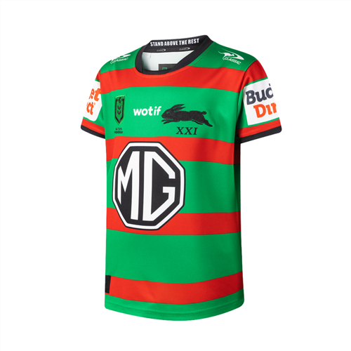 Iconic Rabbitohs red and green home design with XXI premiership detail