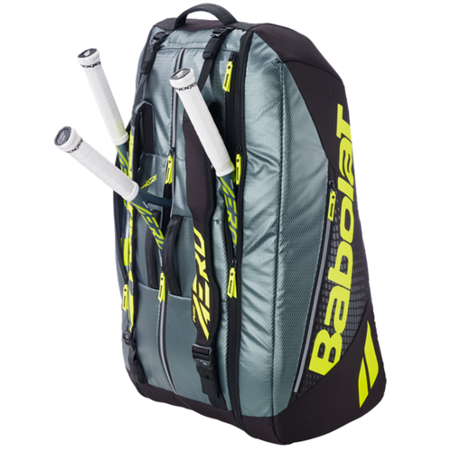 It is designed to carry 12 tennis rackets across three main compartments.
