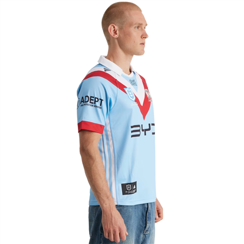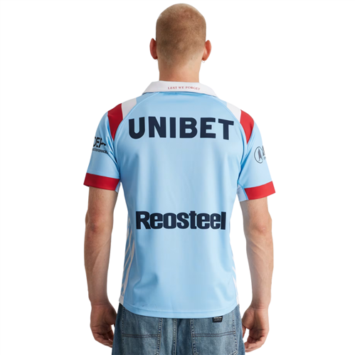 The Bondi Blue colourway sits at the centre of this jersey, reflecting the Roosters’ wartime history when navy dye was reserved for military uniforms. The ANZAC-inspired design elements honour service and sacrifice, making it a strong choice for fans who want to represent both club and occasion with purpose.