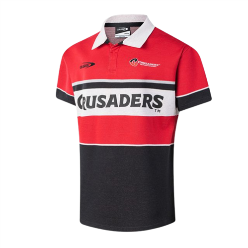 This Crusaders rugby jersey features the club’s iconic colours and a traditional collar. The design reflects classic rugby jerseys worn in earlier eras, making it a strong choice for long time supporters.