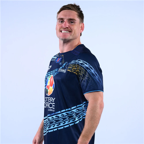 The design reflects Joseph’s Samoan heritage and his view of what it means to be a Titan. The graphics at the base of the shirt represent the strong foundations needed to build success. These patterns extend around the tee and connect at the Titans logo, symbolising the community, culture, care, and unity that support the club.