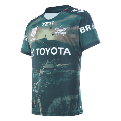 The graphic elements are based on the idea of combined arms, drawing parallels between coordinated military units and a well organised rugby league side. It’s a subtle link, but one that fits the way the Cowboys play when combinations click.