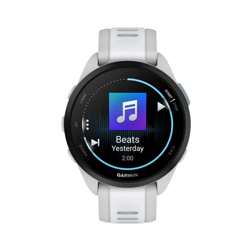 The Music model includes onboard storage for up to 500 songs and can connect directly to Bluetooth headphones. The standard Forerunner 165 does not include music storage.